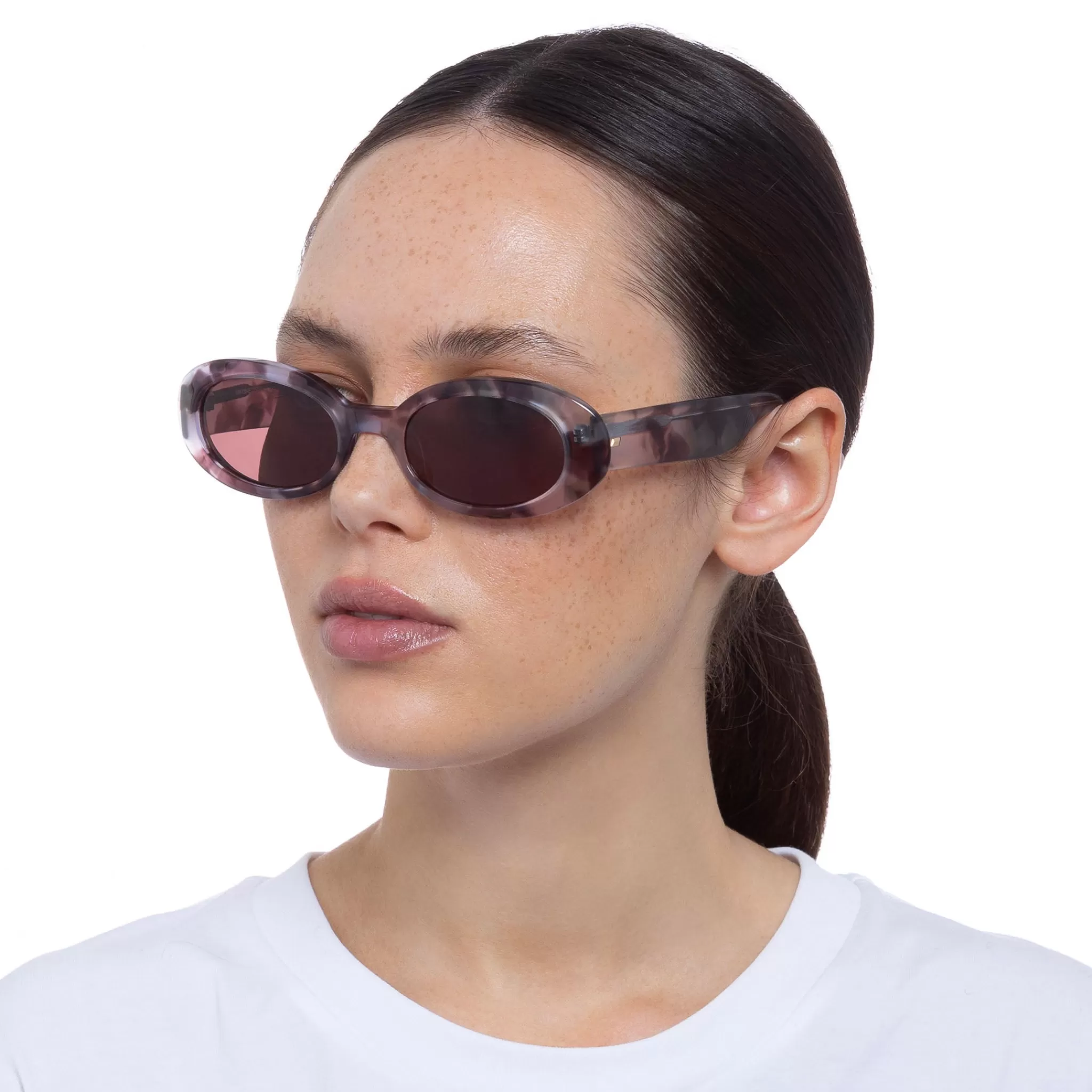 Crafted from bespoke grey and pastel textured tortoiseshell acetate with dark lenses.