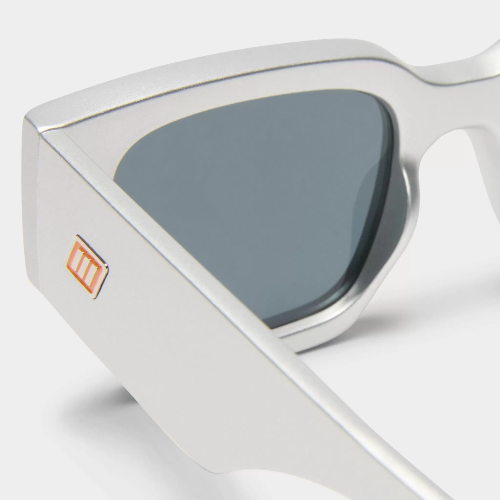 • Finished in a matte silver chrome frame with dark smoke lenses.
