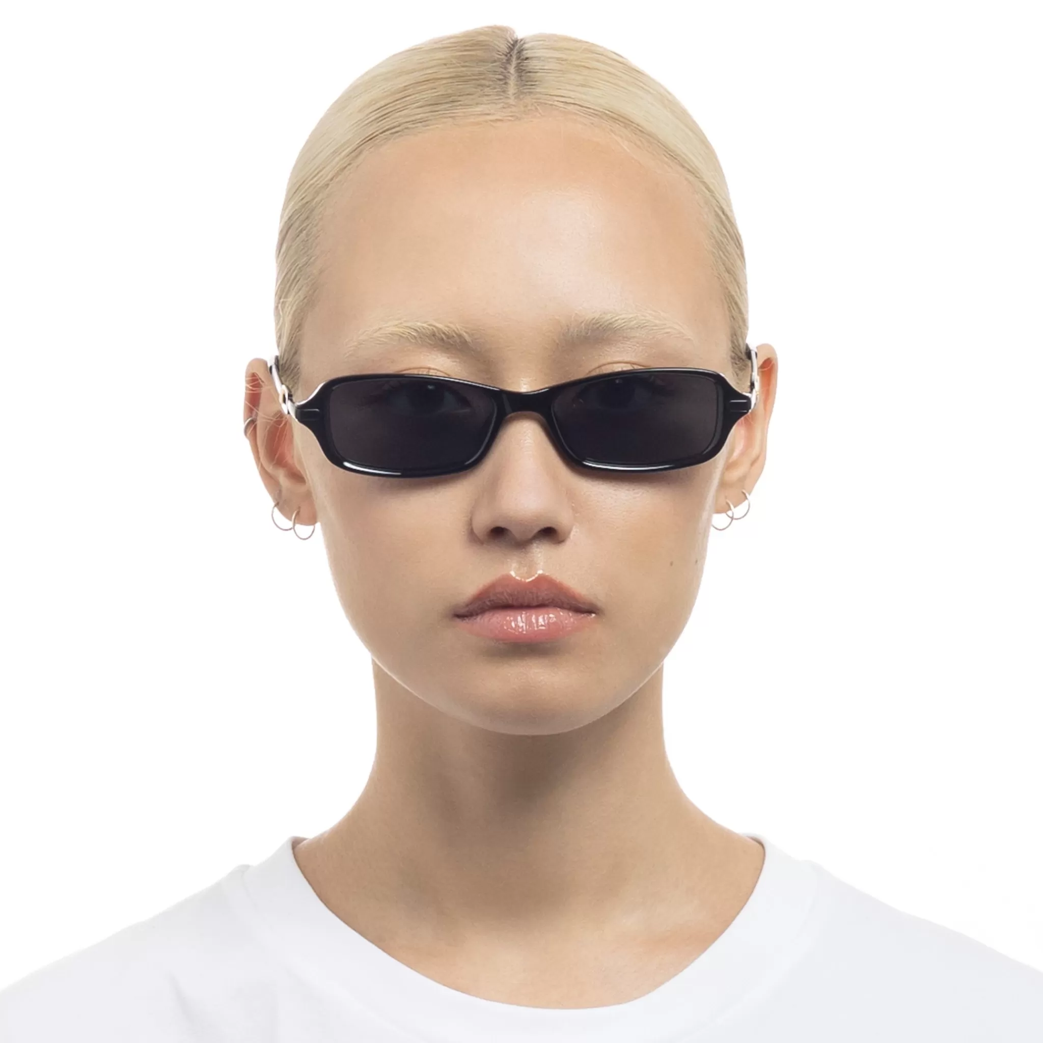 Our BAMBOOZLER sunglasses offer a simplified Y2K aesthetic with narrow proportions. Designed with a fine profile, this rectangular silhouette features our three-dimensionally crafted cut out Le Specs geometric flag stripe buckle temple.