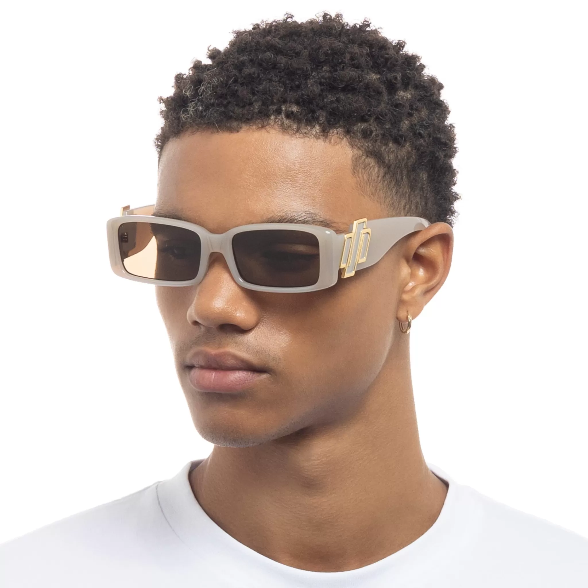 Finished in a milky grey brown frame with bright gold hardware and tonal light brown tint lenses.