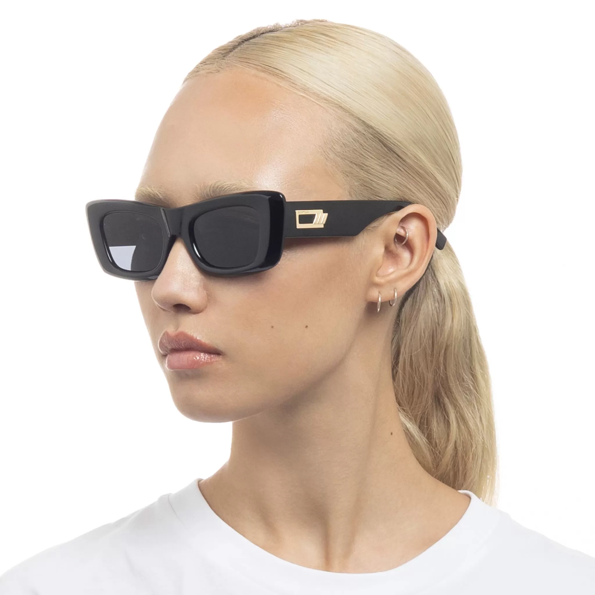 With exaggerated angles and dramatic chamfering detail, our DOPAMINE sunglasses are a new season wardrobe must have. Designed with a wide fit, this oversized rectangle frame features Le Specs geometric flagstripe buckle hardware on both temples.