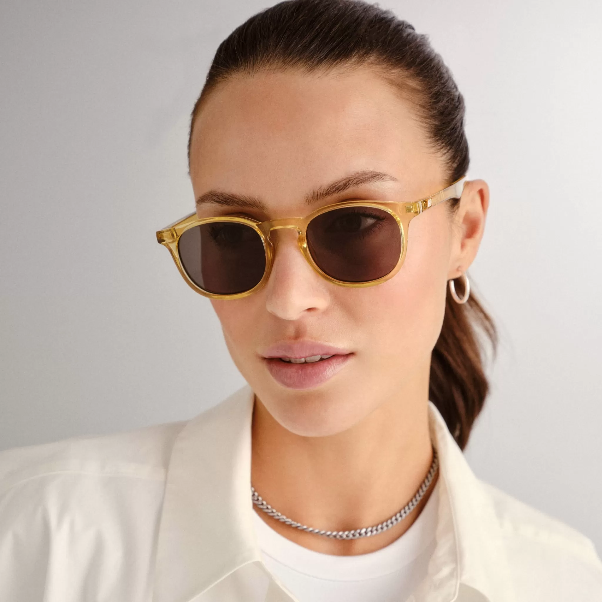 Finished in a vintage translucent tan frame paired with contrast dark lenses.
