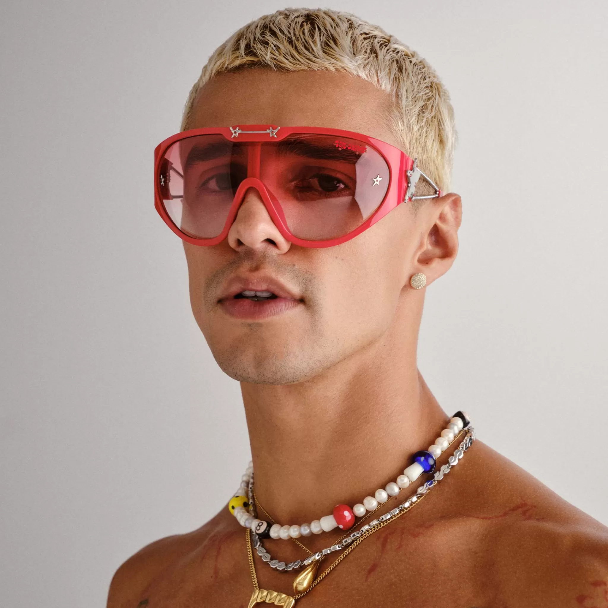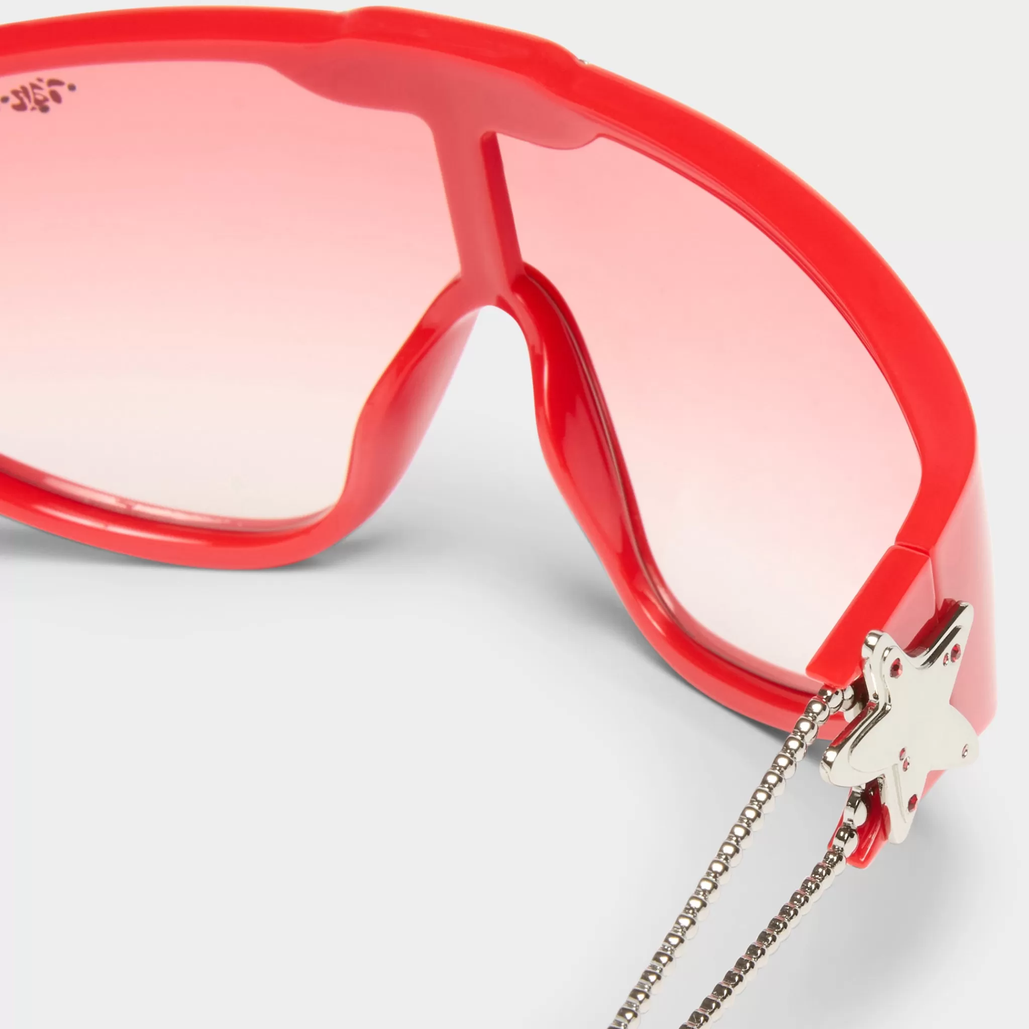 Designed with extreme proportions NEPO BABY ski shield style sunglasses are a statement piece, offering a snug fit to the face. Featuring a three dimensionally crafted bead-like metal temple with stacked Ian Charms star and crystal detailing, this frame is finished with custom flared tip shape and bright red Ian Charms logo printed to upper right lens.