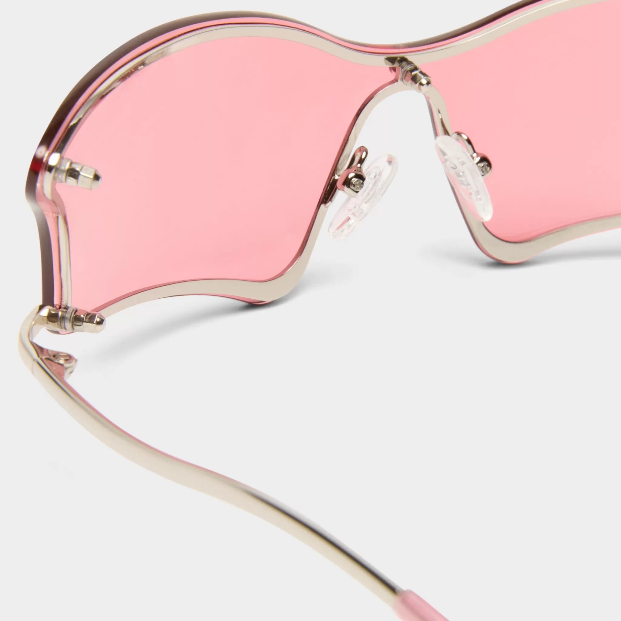 • Finished in a shiny bright silver frame with light pink tinted lenses.