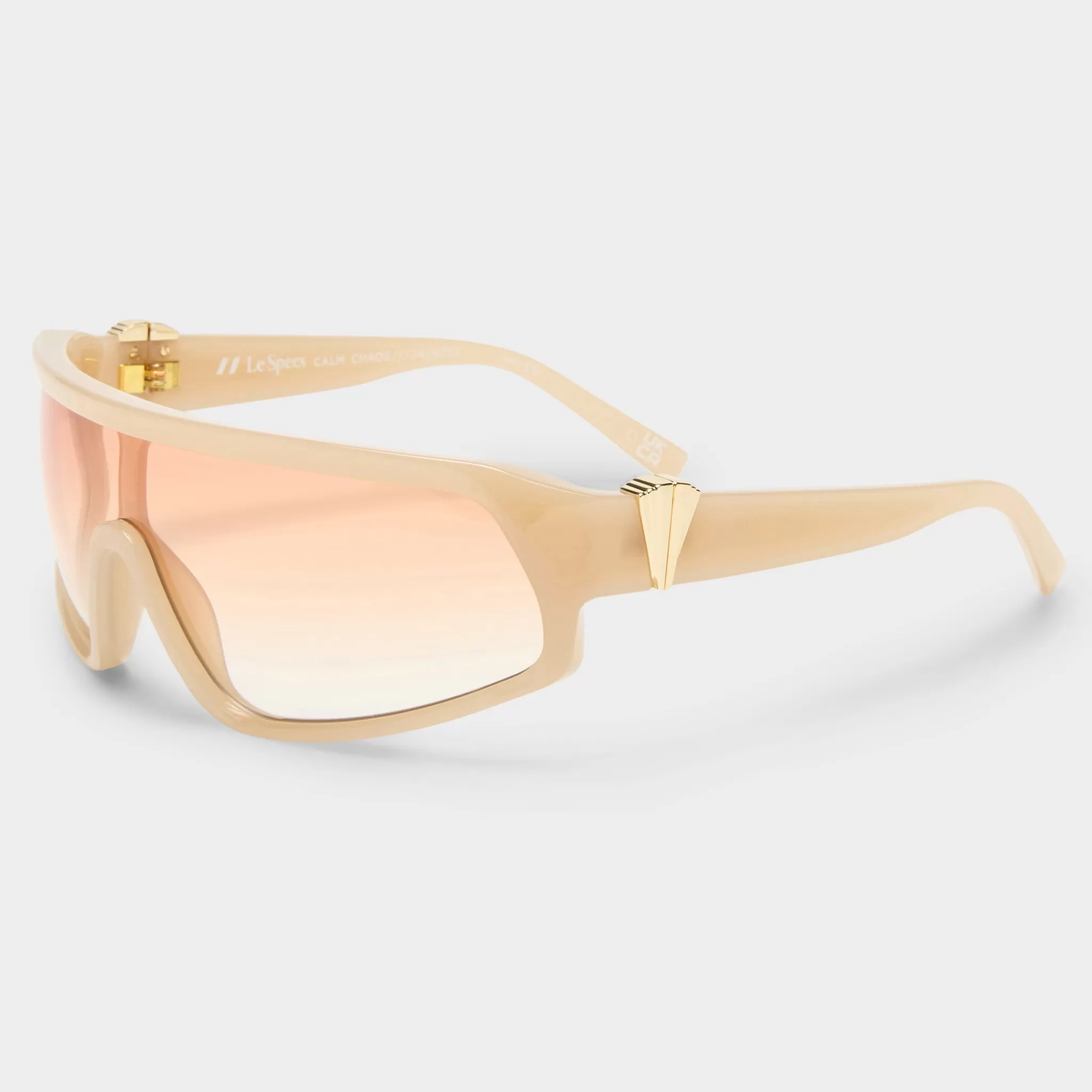 Combining soft and sharp lines, our CALM CHAOS shield sunglasses offer a bold aesthetic. Finished with a wraparound profile, these oversized shield frames feature bespoke Le Specs geometric stacked hardware that extends from front frame through to temple.