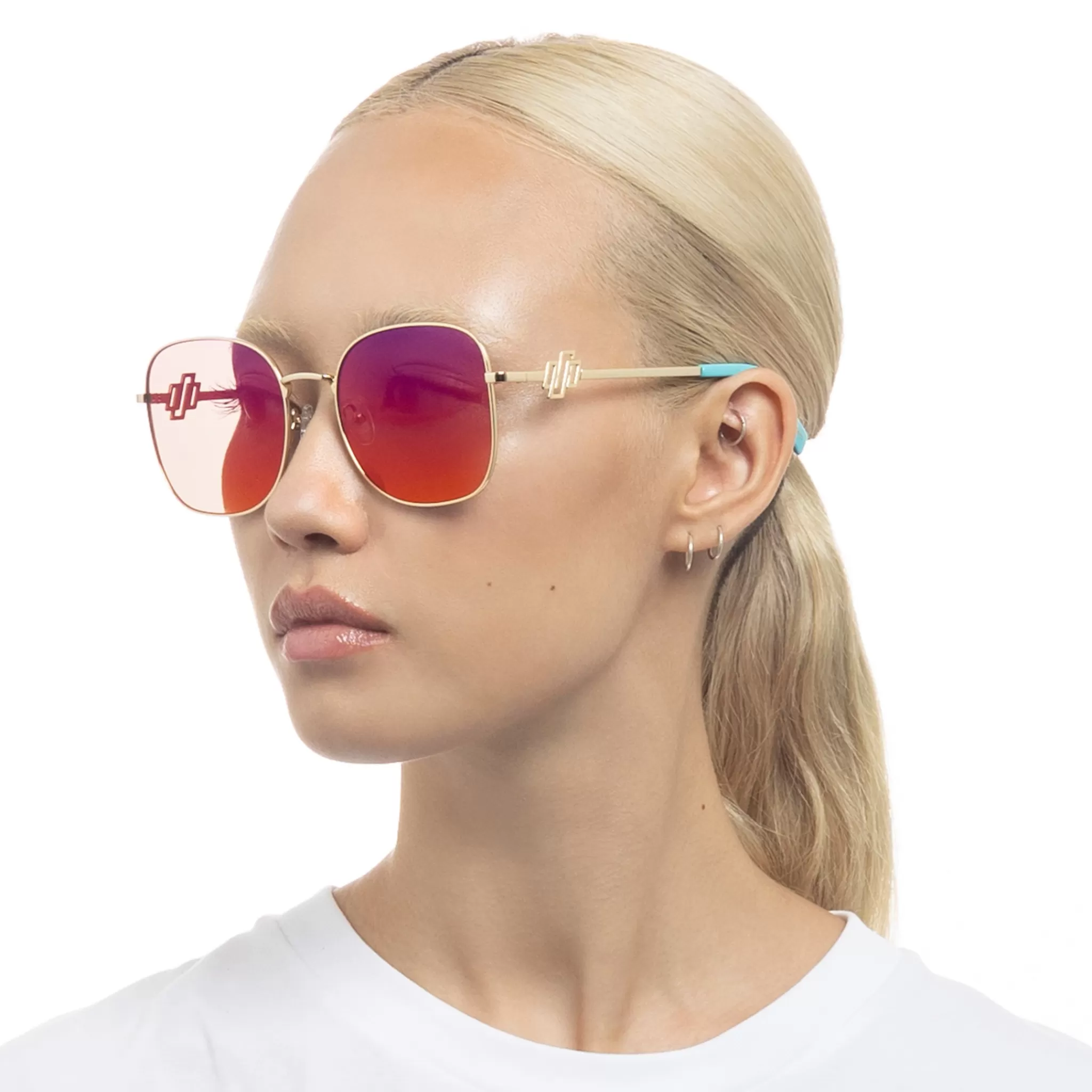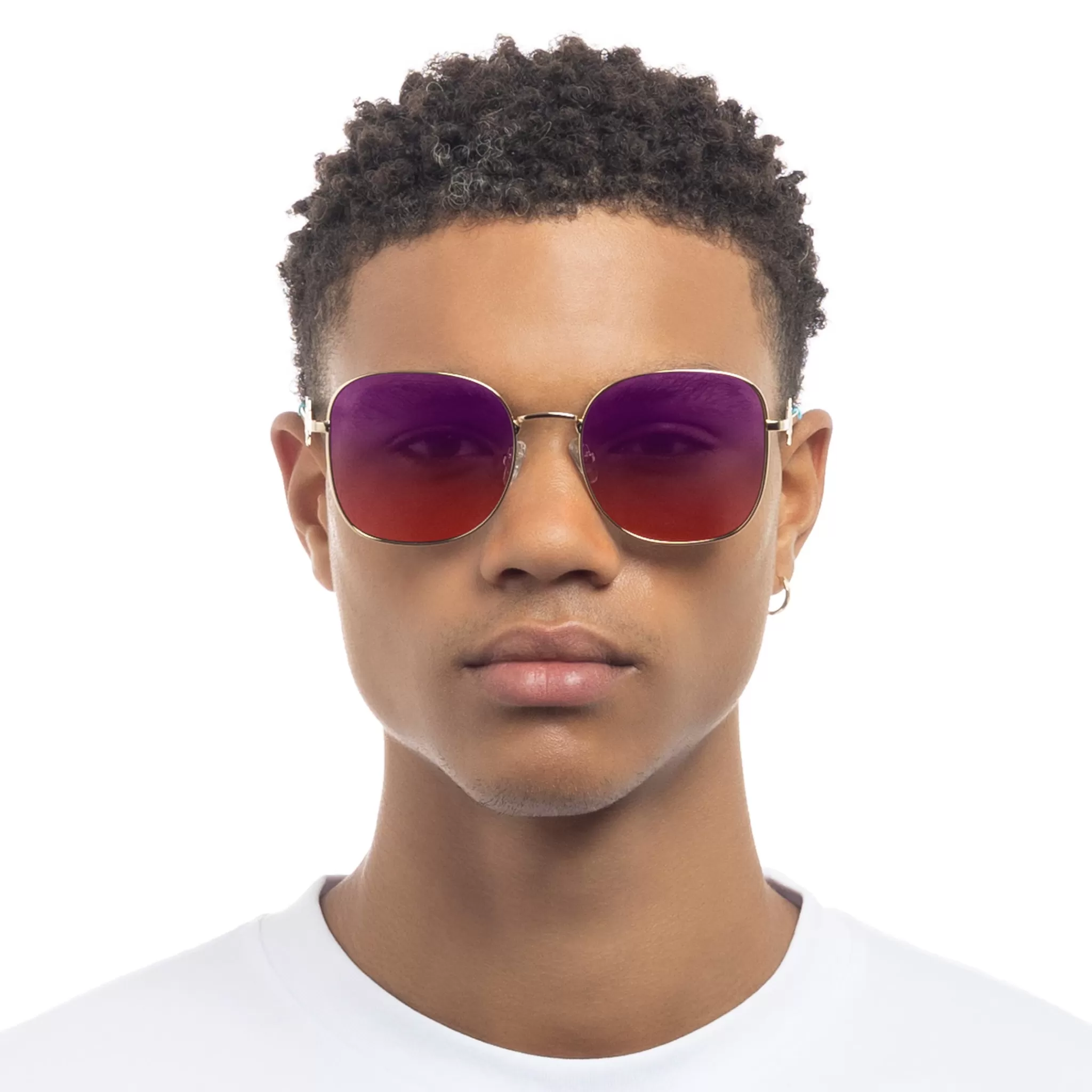 Finished in shiny bright gold with vibrant purple and orange mirror lenses.