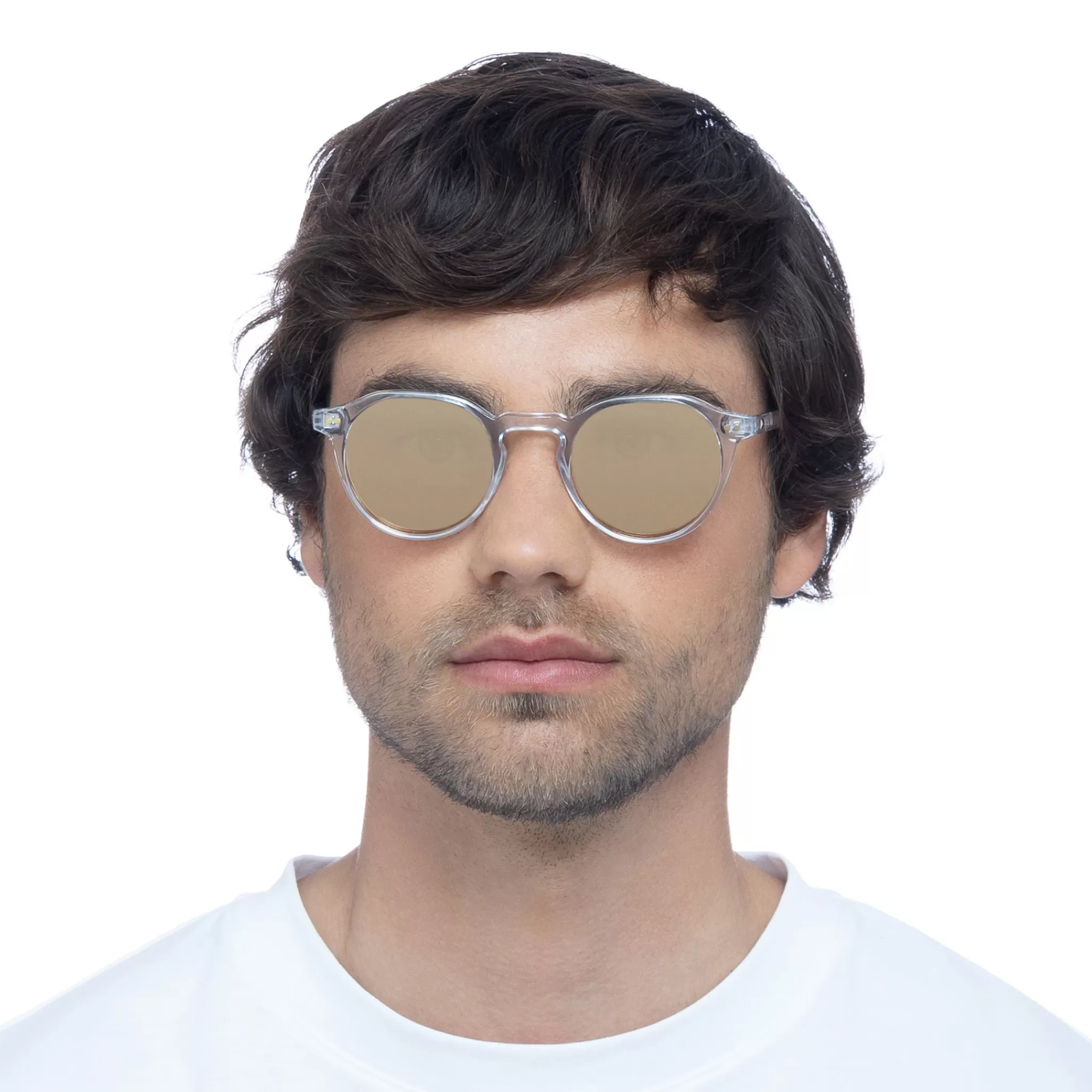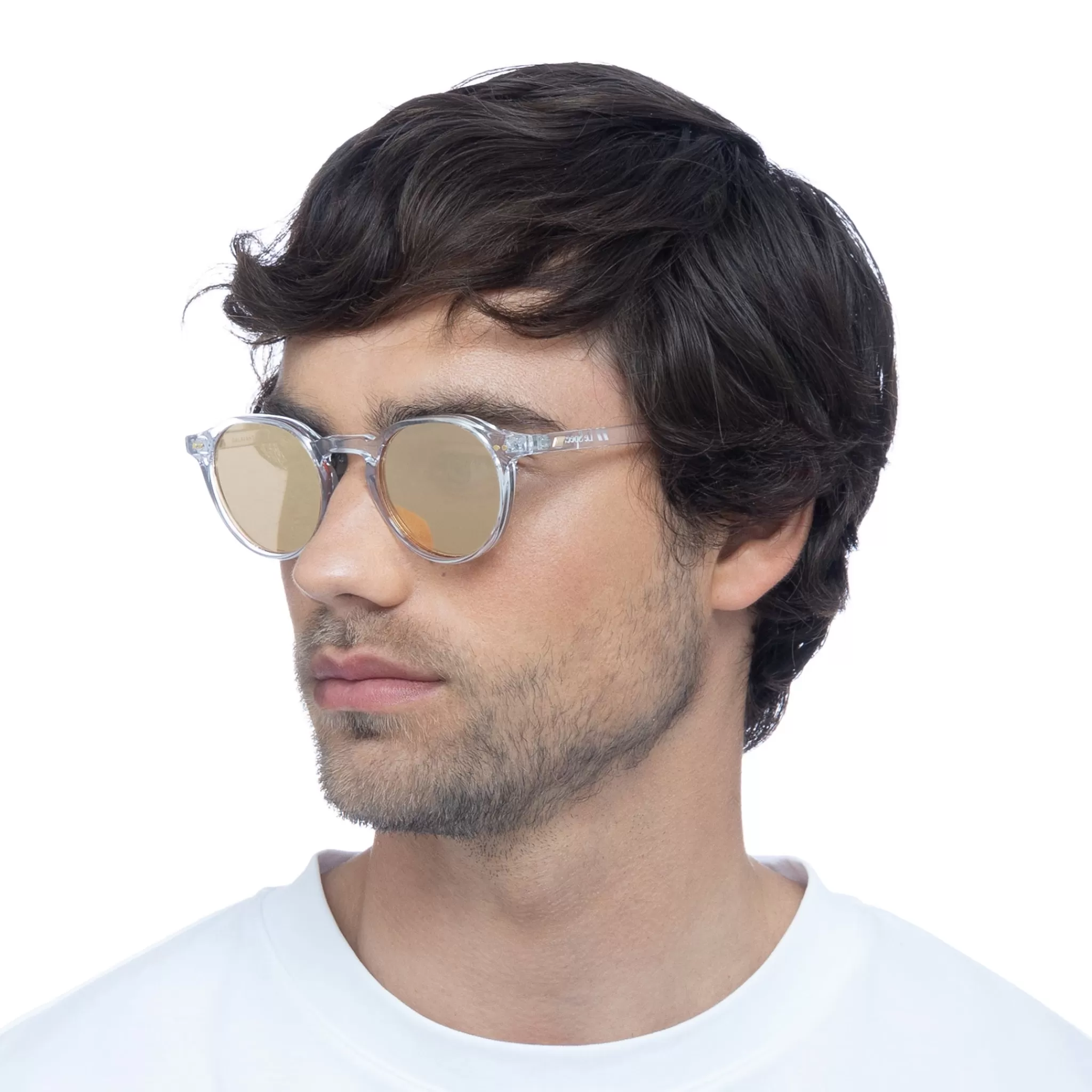 Finished in a translucent clear frame with contrast bronze mirror lenses.