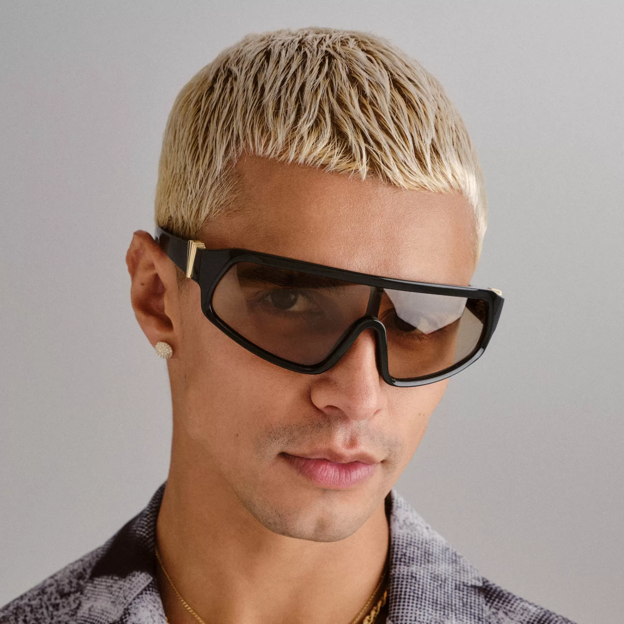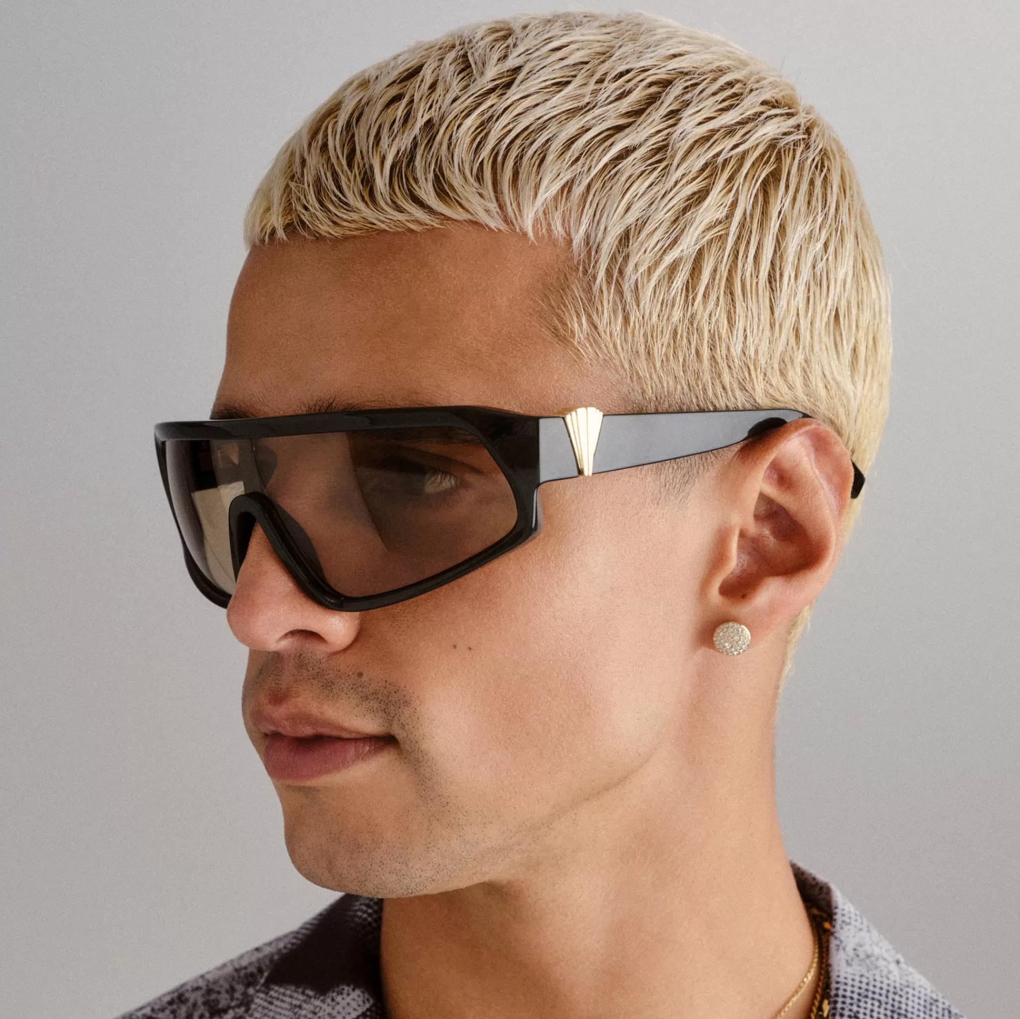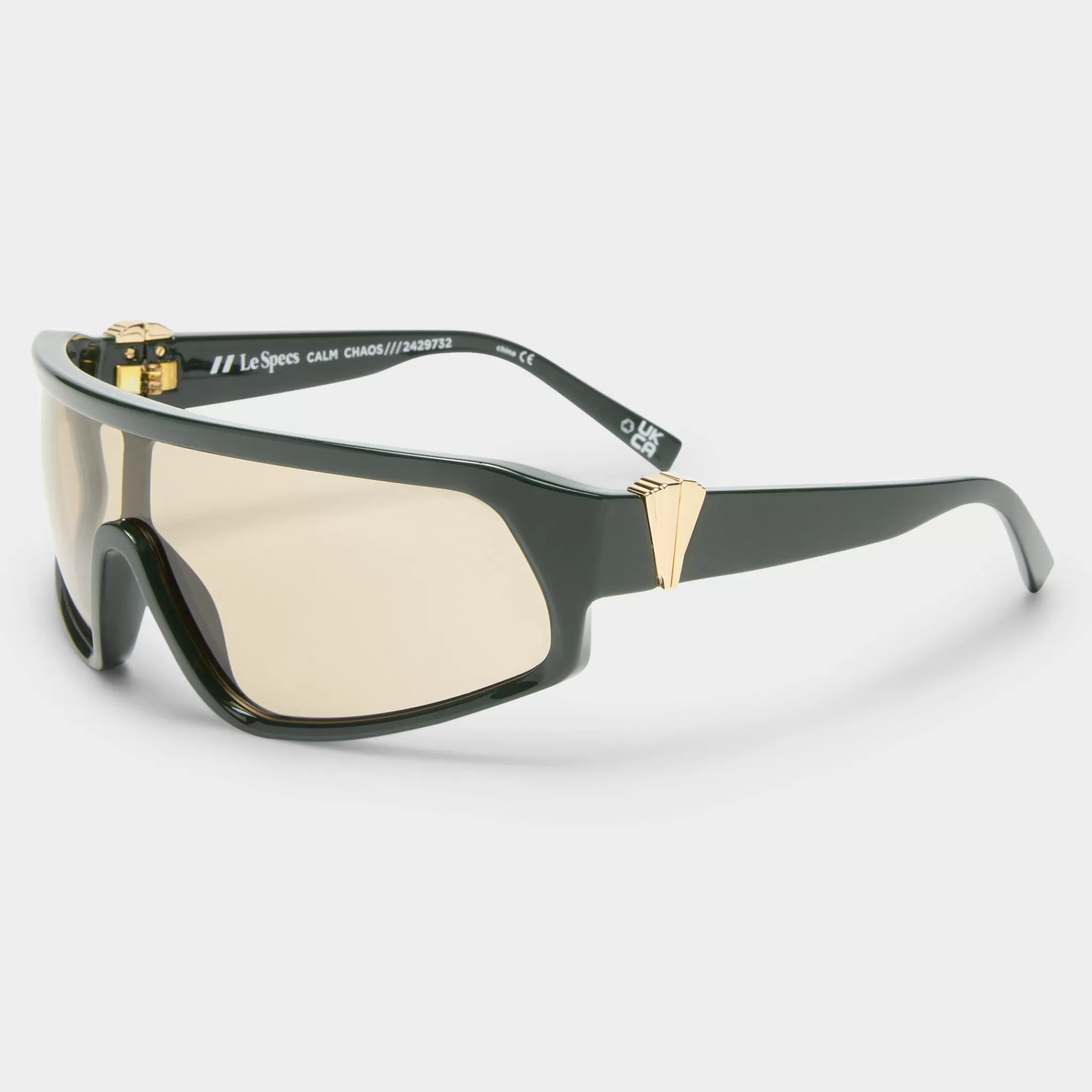 Combining soft and sharp lines, our CALM CHAOS shield sunglasses offer a bold aesthetic. Finished with a wraparound profile, these oversized shield frames feature bespoke Le Specs geometric stacked hardware that extends from front frame through to temple.